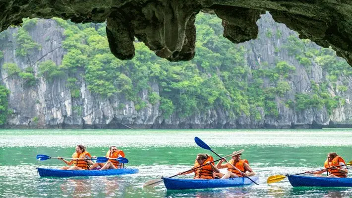 يُعد التجديف بالكاياك من أكثر الأنشطة متعة في خليج هالونج، حيث يسمح بالاقتراب من التكوينات الصخرية والكهوف الصغيرة التي لا تصلها القوارب الكبيرة. هذه التجربة تمنح الزائر إحساسًا بالمغامرة الخفيفة والتفاعل المباشر مع الطبيعة. النشاط مناسب للمبتدئين، ويُعد خيارًا مثاليًا لمحبي الحركة والتصوير من زوايا قريبة وفريدة.