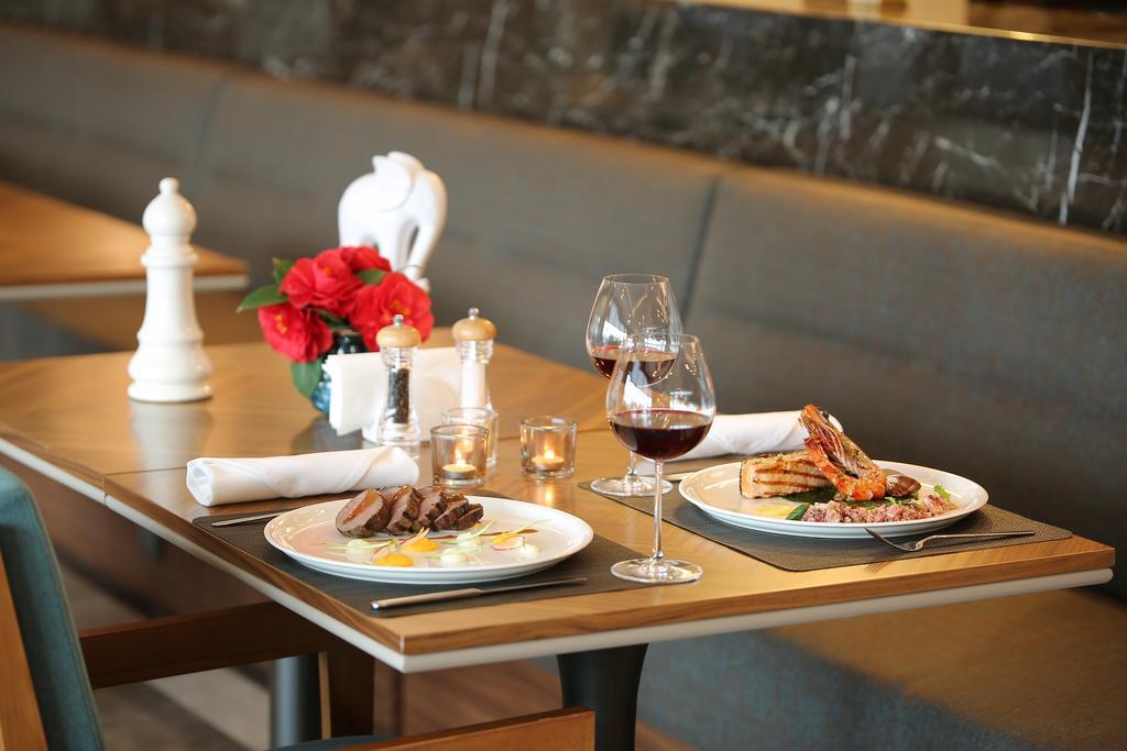 يضم فندق هوليدي ان بورصا مطعم واحد يقدم عدد من المأكولات المحلية التركية، والأوروبية التي تقدم على نظام البوفيه، وقائمة الطعام.