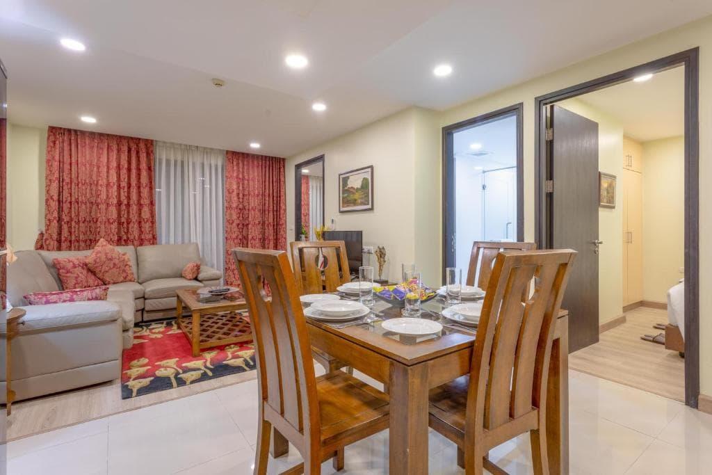تشتمل الشقق المكيفة بمنطقة جلوس مع تلفزيون بشاشة مسطحة أتش دي 42 بوصة وأريكة جلدية . تتوفر طاولة لتناول الطعام. كما يأتي المطبخ مع فرن وموقد سيراميكي مؤلف من 4 منافذ بالإضافة إلي الميكروويف وأدوات المطبخ.
