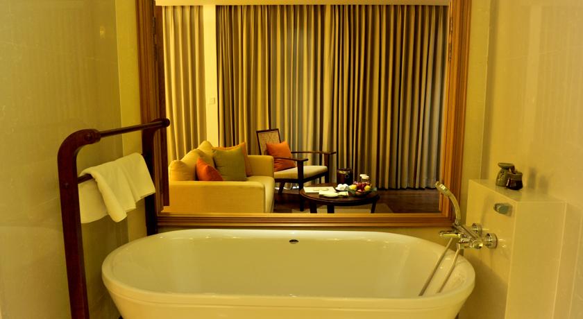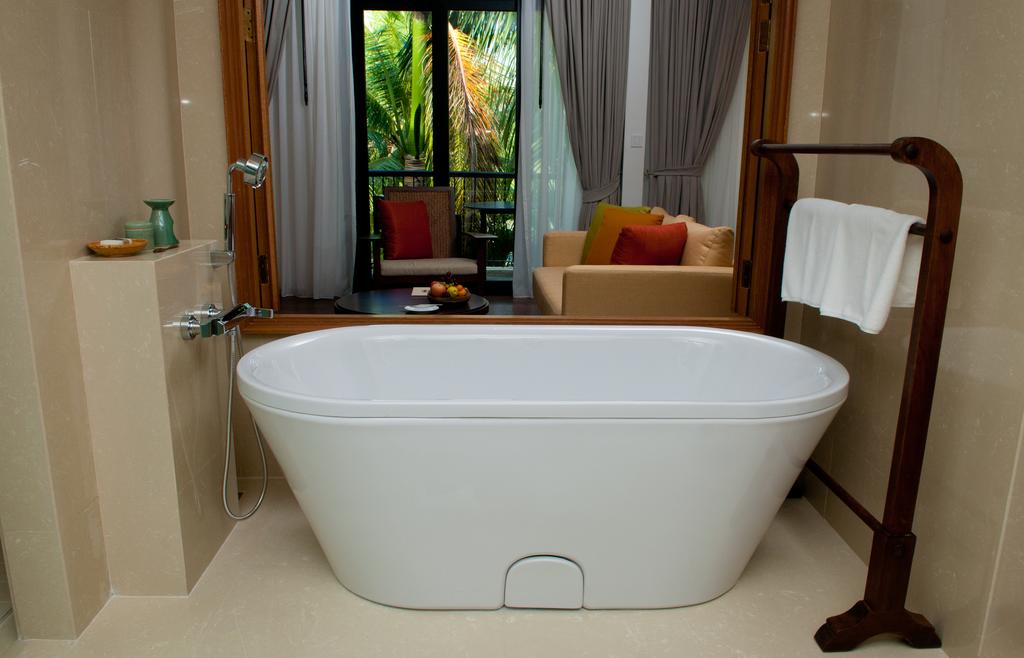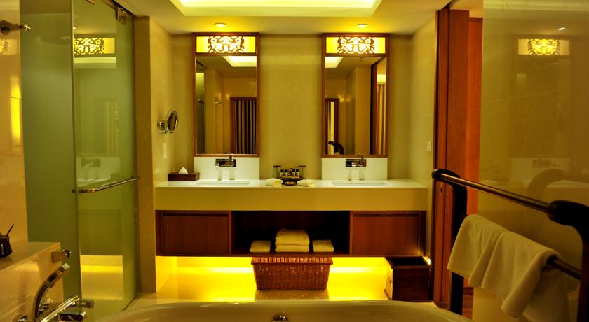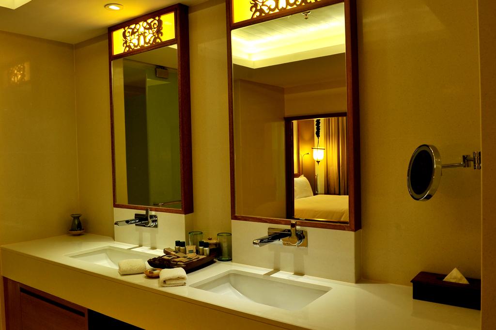 ويحتوي حمام الغرفة على حوض استحمام بألوان مبهجة، وحوض غسيل أيدي كبير وتحته أدراج لحفظ مستحضرات التجميل والمناشف، وبه قطع صابون وشامبو وغسول لتنظيف الأيدي وماء تواليت عطري.
