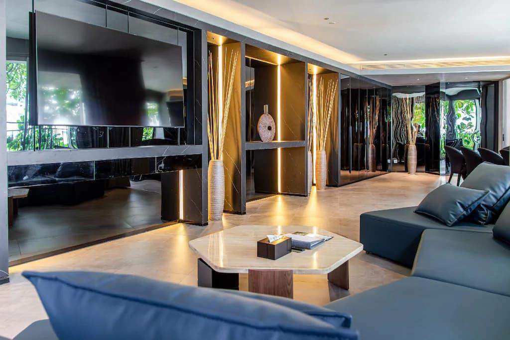 يقع في الطابق الأرضي، ويعد المكان الأنسب للقاءات السريعة أو للاسترخاء بعد رحلة الوصول.