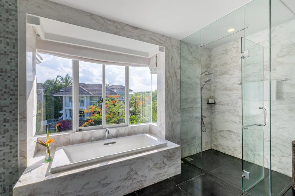 وفي الخارج، تمنح التراسات الواسعة مع المسابح الخاصة خصوصية وهدوءًا مطلقين. أما الحمامات المصنوعة من الرخام الفاخر فتوفّر تجربة استحمام راقية بفضل الروب الناعم ومجفف الشعر ومستلزمات الرفاهية المختارة بعناية.