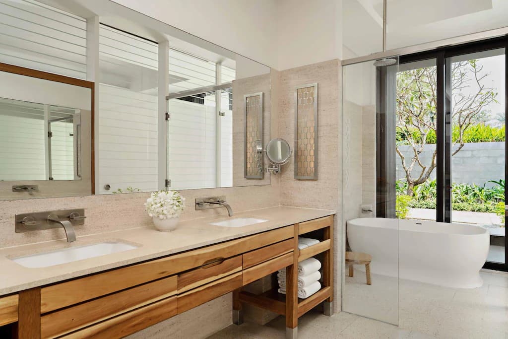 أما الحمّام الرخامي الخاص فيحتوي على حوض استحمام ودش مطري مستقل ولوازم استحمام مجانية.
