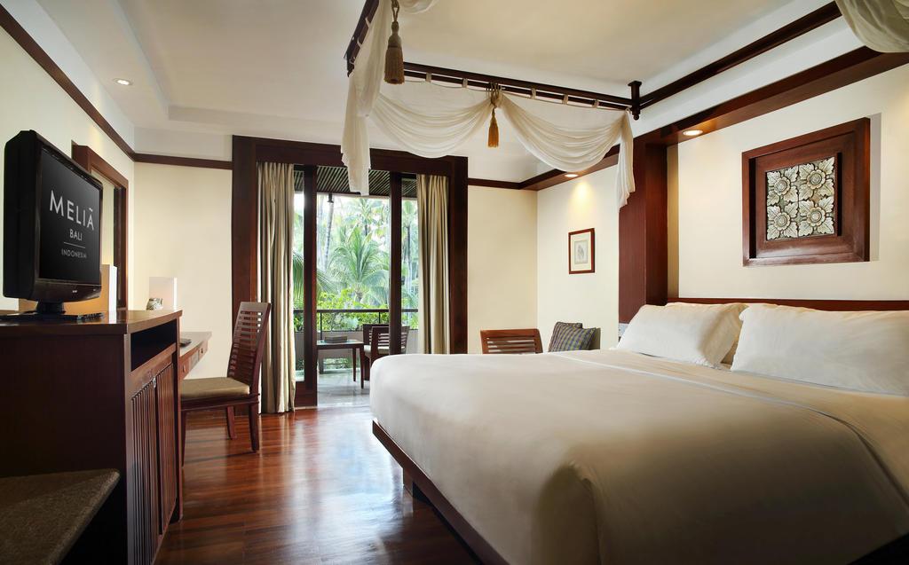 غرف فندق ميليا ريزورت - نوسا بالي إندونيسيا تحتوي على شرفة تطل على الحدائق أو الشاطئ الخاص، وكل غرفة تحتوي على جهاز تلفاز يحتوي على العديد من القنوات الفضائية، آلة صنع الشاي، آلة صنع القهوة، خزينة يتم وضع الودائع والأشياء الثمينة بها، ويوجد أيضًا حمام يحتوي على دُش وحوض استحمام وأدوات استحمام مجانية.