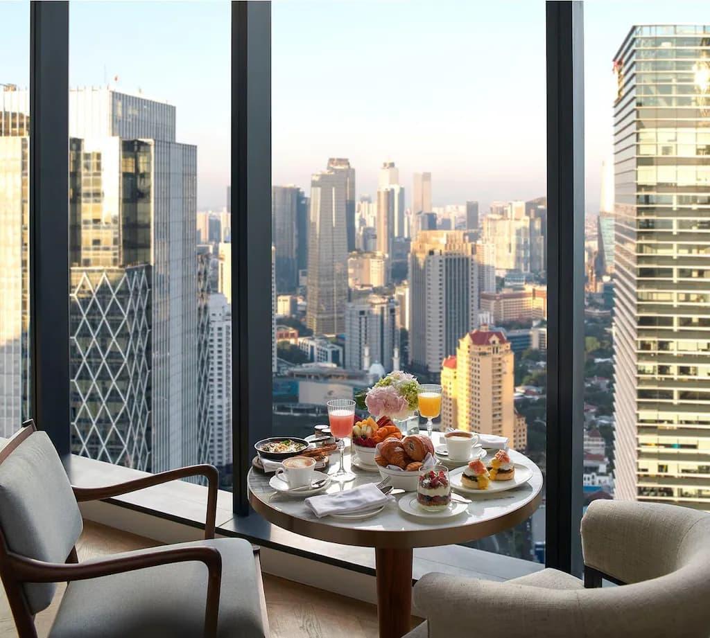 تتوفر وجبة الإفطار كل صباح وتشمل خيارات بوفيه وقائمة انتقائية وكونتيننتال ، كما يمكن للضيوف تناول المأكولات الكانتونية والبريطانية واليابانية. تتوفر أيضا خيارات نباتية وخالية من منتجات الألبان ونباتية عند الطلب ، مما جعله من فنادق 5 نجوم في اندونيسيا.