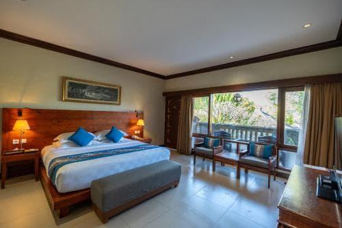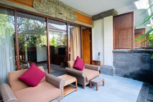 الغرف تتميز الفيلات بالطراز البالي الاستثنائي وتحتوي على شرفة خاصة مع إطلالات على الحديقة ، ما جعله من أفضل منتجعات بالي للعوائل.